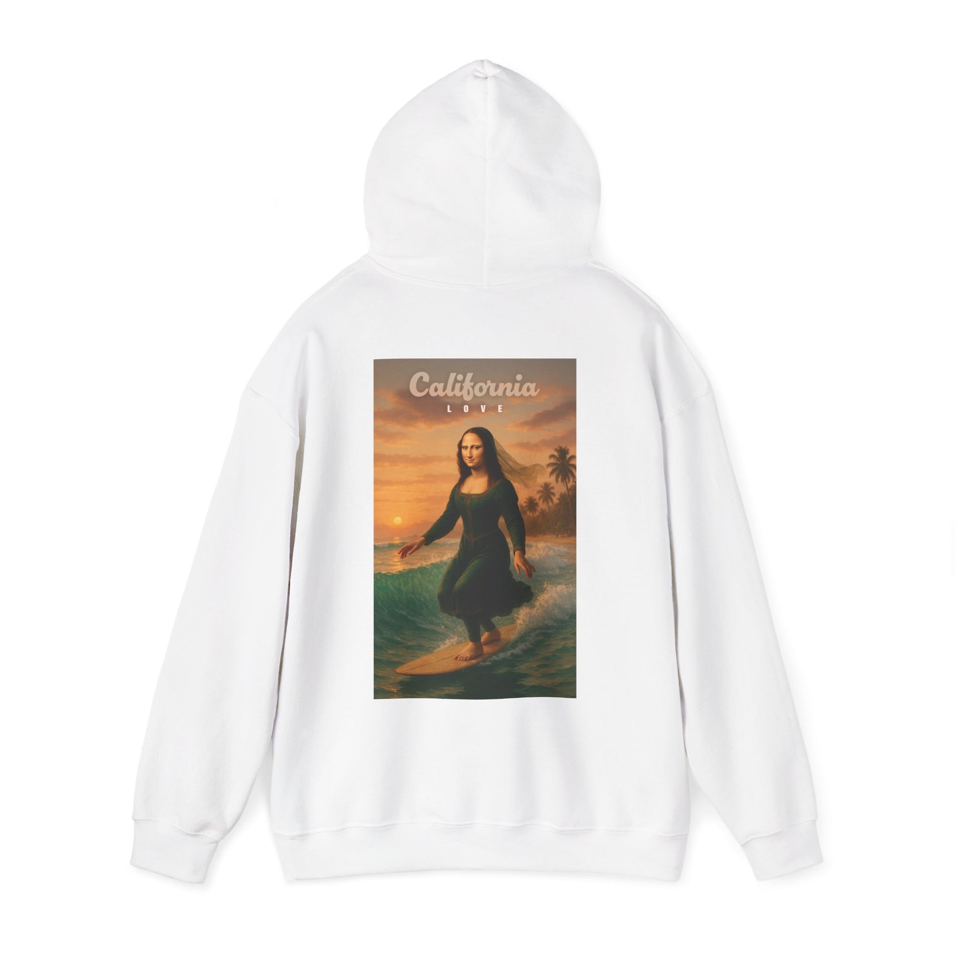Featuring a soft white base, a subtle “California” script on the front, and a bold back print of a surfing Mona Lisa against a golden sunset, this hoodie is designed for everyday wear with personality.