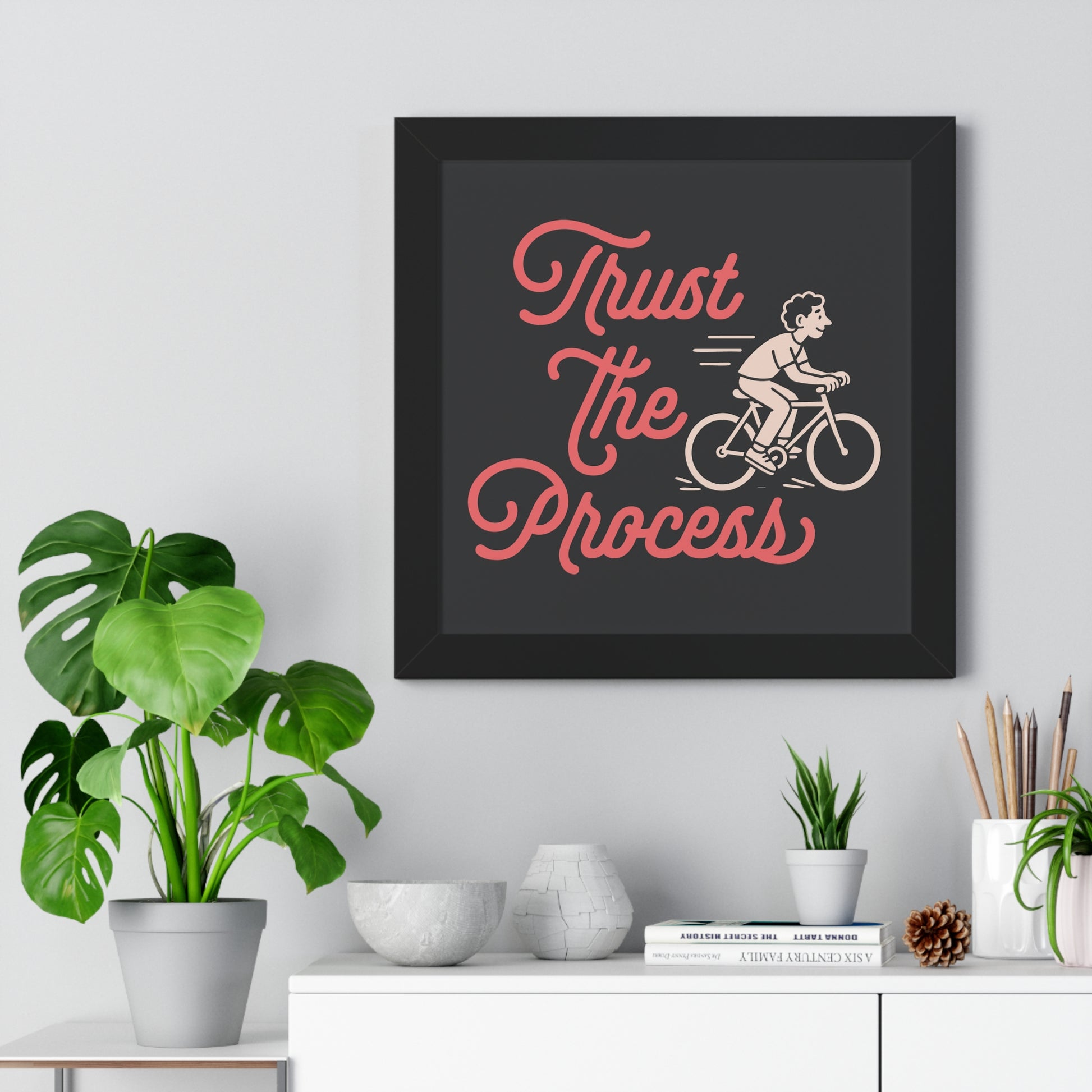 A motivational poster with the message 'trust the process'. It provides a sense of encouragement and positivity, reminding the viewer to keep moving forward. Perfect for those in need of a daily dose of inspiration, whether it's for a home office, dorm room, or workspace. Ideal for individuals looking for some motivation and encouragement in their lives.