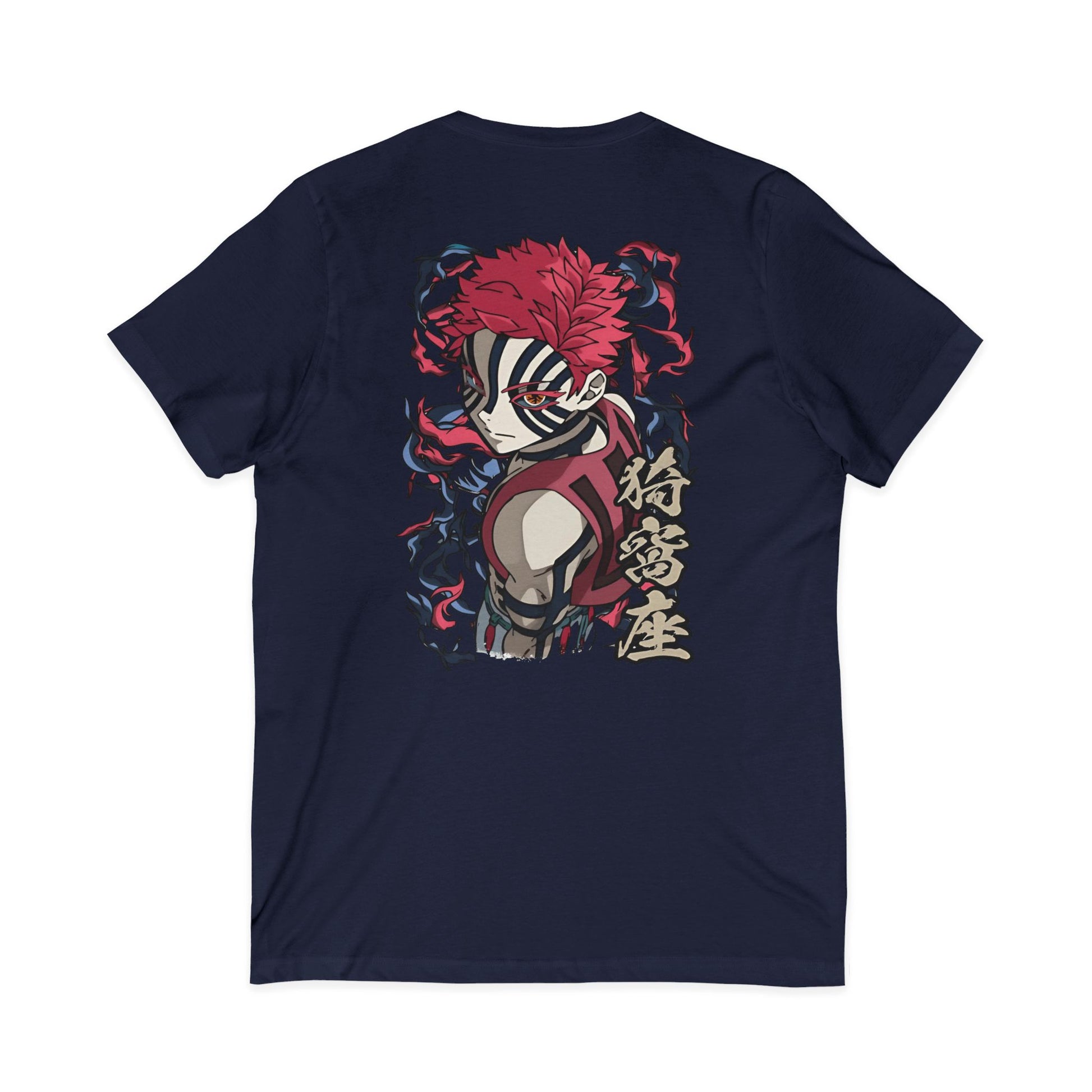 A lightweight V-neck tee that brings anime-inspired edge to everyday wear. The front features a vertical kanji column in a distressed, sandy tone, while the back showcases a bold, graphic character portrait with dramatic red hair and mask-like face markings set against swirling dark accents. The slim retail fit and soft cotton knit make it comfortable for layered looks or worn alone. It reads like a wearable panel from a graphic novel — moody, intense, and ready for city streets, conventions, or late-night meetups with friends who speak the same visual language.