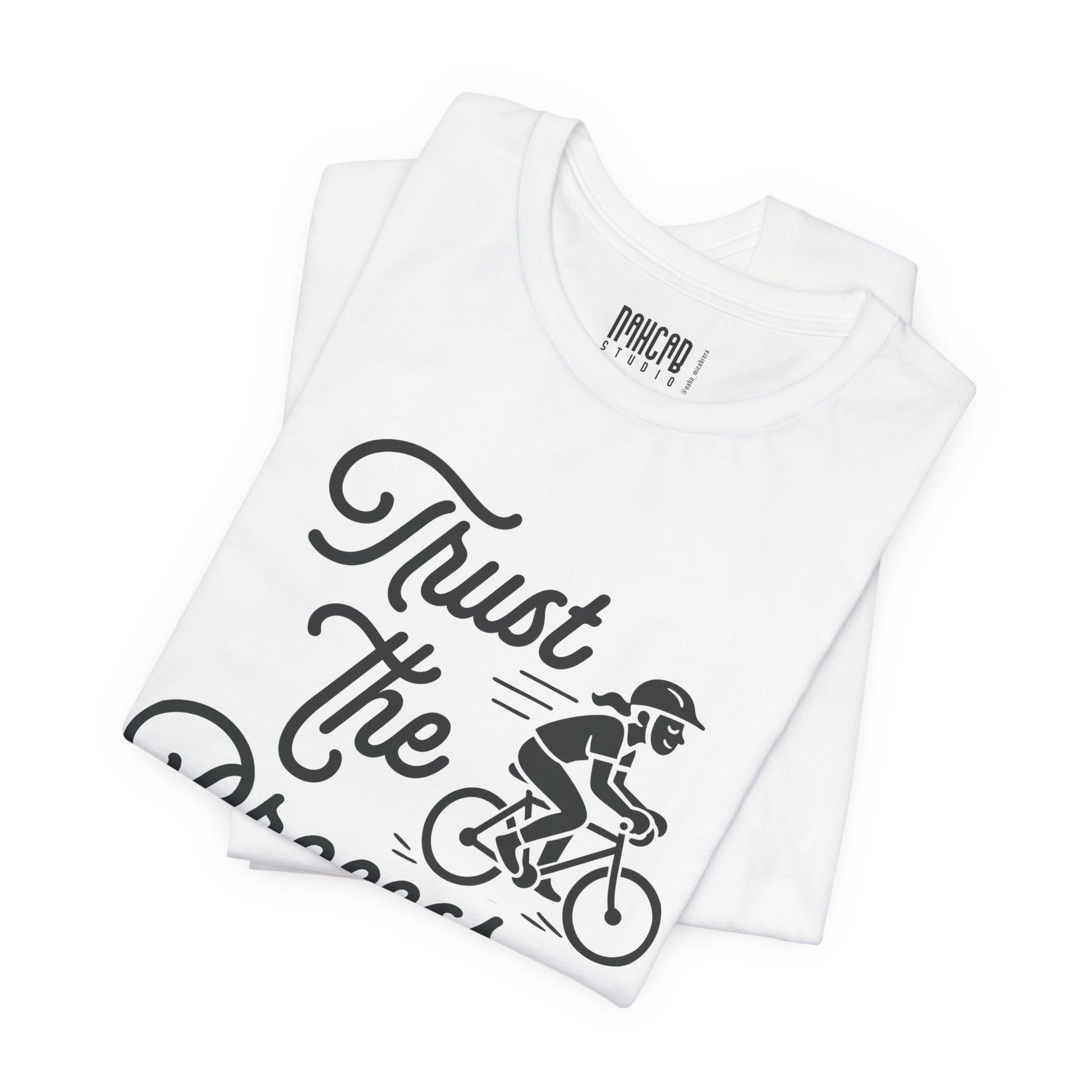 This lightweight, breathable tee blends comfort with intention. Designed with a gentle vintage vibe, it features soft Airlume cotton, a clean crew neckline, and a subtle cycling-inspired illustration paired with the phrase “Trust the Process.”